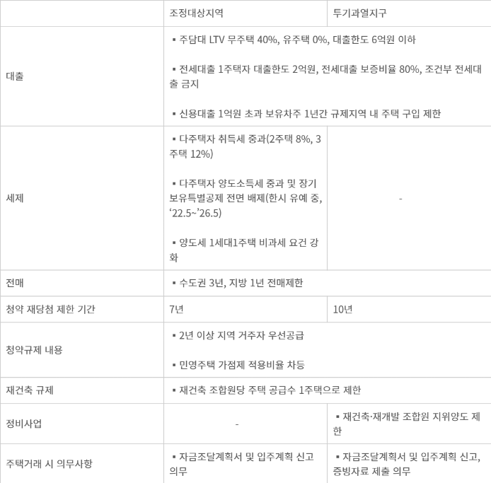 정부는 또 오는 20일부터 이들 지역 전체를 토지거래허가구역으로 지정해 주택 구입 시 실거주 의무(2년)를 부과하는 한편 전세를 끼고 집을 사는 행위(갭투자)를 차단한다. 내년 12월 31일까지 발효되며 필요시 연장할 방침이다. 특히 기존에는 토허제, 조정지역 등의 규제의 경우 해당 지역내 아파트만 해당됐지만 이번 대책으로 아파트가 1개동 이상 포함된 연립 및 다세대 주택까지도 적용된다.