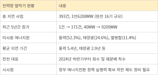 지연 건수는 2021년 1건에서 2025년 171건으로 급증했으며, 이에 따른 미사용 전력망 용량도 40MW에서 9209MW로 무려 230배 증가했다. 이러한 가파른 증가세는 발전사업자의 전력망 선점 이후 장기 지연 또는 사업 중단이 구조화되고 있음을 보여준다.