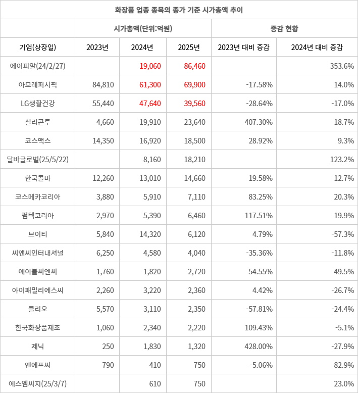 유상증자 등으로 발행주식수가 변하는 경우 시가총액만으로 개별 주가 흐름을 단정하기는 어렵다. 하지만 희석 이벤트가 잦지 않은 대형주의 경우 시가총액의 중장기 추이는 주가의 전반적인 방향성을 가늠하는 참고 지표로 활용된다. 실제로 지난해 에이피알의 주가가 급등한 것과 달리 LG생활건강은 지속해서 하락했다. 아모레퍼시픽은 2024년 중반 고점 형성 이후 반등과 조정을 반복하며 박스권에 머물러 있다.