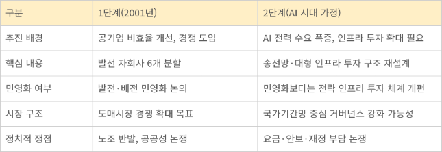 AI 시대 전력 수요 급증이라는 새로운 환경에서 거론되는 '2단계 전력산업 구조개편'은 과거와 성격이 다를 것으로 분석된다. 1단계가 민영화 중심이었다면, 2단계는 인프라 투자에 대한 체계를 재설계하는 것에 방점이 찍힐 가능성이 높다는 것이다.