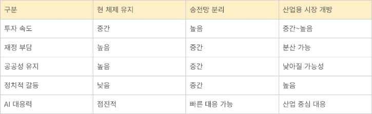 AI 데이터센터와 반도체 산업이 요구하는 기가와트(GW) 단위 전력 수요를 감당하기 위해서는 막대한 송전망 투자와 전원 확충이 필요하다. 현재의 한전 중심 수직 통합 체제가 이러한 대규모 투자를 신속히 감당할 수 있을지에 대한 의문도 제기된다.