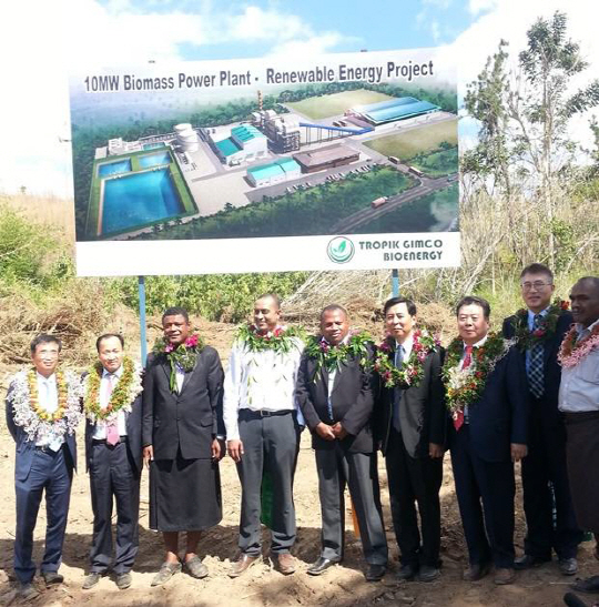 ▲2014년 8월 송용희 GIMCO 대표이사 회장(왼쪽에서 두 번째) 등 한국과 피지의 관계자들이 참석한 가운데 피지 난보우에서 열린 발전용량 12MW 규모의 바이오매스 우드칩 발전소 착공식 장면 |