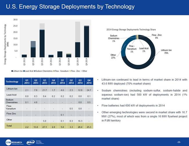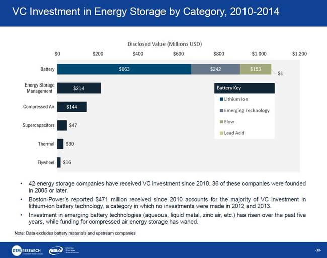 2010∼2014년간 에너지저장장치 투자액을 보면 리튬이온전지형에 6억6300만달러가 투자됐고 납축전지에 1백만달러, 레독스흐름전지에 1억5300만달러, 나트륨 계열 등 기타 차세대 전지에 2억4200만달러가 투자됐다.