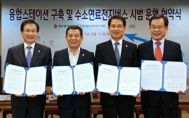 현대차그룹은 11일 광주광역시청에서 윤장현 광주광역시장, 유기호 광주혁신센터장, 권문식 현대차 부회장, 오영 광주그린카진흥원장 등 행사관계자가 참석한 가운데 ‘융합스테이션 구축 및 수소연료전지버스 시범운행을 위한 업무협약’을 맺었다.