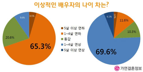 전체의 20.6%는 동갑을 선호했으며 9.6%는 1살에서 4살 가량의 연상을 원한다고 답했다. 5살 이상 연하를 원하는 응답자는 4.5%로 집계됐다.