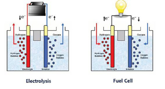 ▲수전해(Electrolysis)와 연료전지(Fuel Cell)의 반응 차이 |