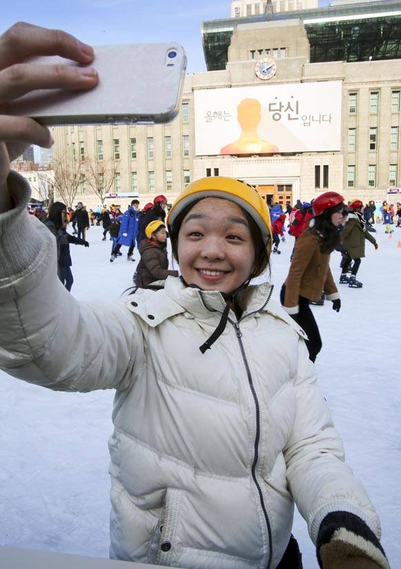 [에너지경제신문 민원기 기자] 찬바람이 강하게 불면서 전국적으로 한파가 몰아친 5일 오전 서울 중구 서울광장 스케이트장을 찾은 여학생이  환하게 웃으며 셀카를 찍고 있다.