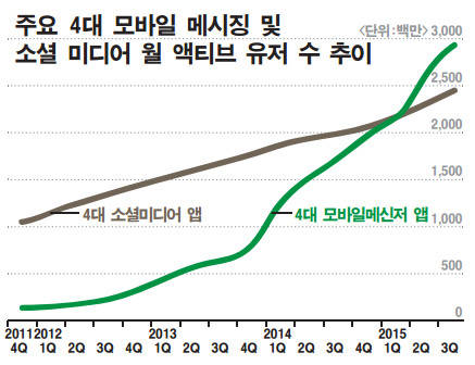 KT경제경영연구소에 따르면 왓츠앱(9억명)·QQ모바일(8억5000만명)·페이스북 메신저(7억명)·위챗(6억5000만명) 등 4대 모바일 메신저의 월간 활성이용자(MAU) 수(작년 3분기 기준)는 약 31억명인 반면 페이스북·유튜브·트위터 등 4대 소셜 미디어의 MAU(약 25억명)를 넘어섰다. 라인(2억1240만명)은 같은 기간 동안 이들 메신저 MAU와 비교해 약 25~33%에 불과하지만 글로벌 시장에 매출이 상위권에 자리 잡았다.