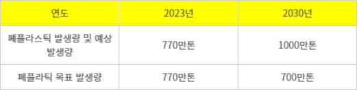 기후부는 물질·화학적 재활용을 제외한 폐플라스틱 발생량이 2023년 기준 770만톤이며 2030년에는 증가세를 감안해 1000만톤이 예상된다고 밝혔다. 기후부는 2030년 예상 발생량을 '30% 감축'시켜 700만톤으로 줄이겠다고 밝혔다.