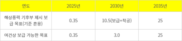 기후부는 상세 자료에서 항만, 선박 등 여건을 고려할 때 2030년까지 실제 보급 가능한 물량은 3GW 수준이라고 명시했다. 이 기준에 맞추면 해상풍력의 실제 보급 목표는 2025년 0.35GW, 2030년 3GW, 2035년 25GW라고 하는 것이 정확하다.