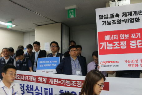 ▲20일 서울 역삼동 해외자원개발협회에서 열린 ‘자원개발 추진체계 개편방안 연구용역 결과 공청회’에서 에너지 공기업 노조가 반대 입장을 표명하고 시위를 하고 있다. |