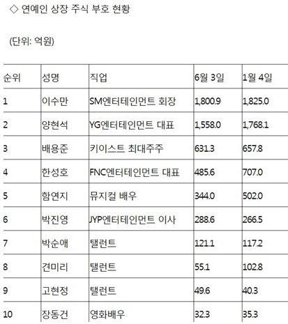 이수만 SM엔터테인먼트 회장이 연초(1825억원)에 비해 1.3% 감소한 1801억원으로 연예인 주식 부자 1위를 지켰다. 2위 양현석 YG엔터테인먼트 대표는 1558억원으로 11.9%나 줄어 이수만 회장과 격차가 많이 벌어졌다. 작년에 양현석 대표는 이 회장을 제치고 연예인 주식 부자 1위에 이름을 올렸다.