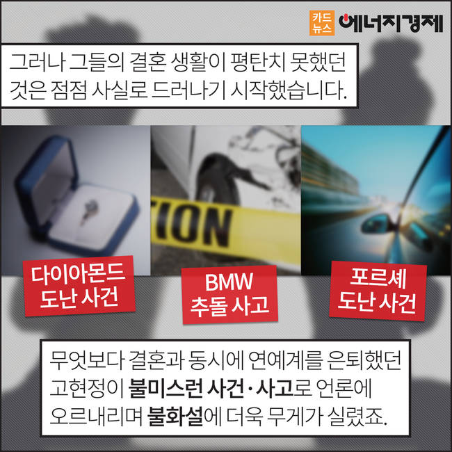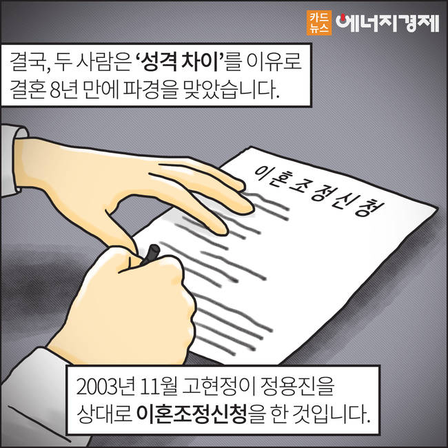 하지만 다이아몬드 도난 사건, BMW 추돌 사고, 포르셰 도난 사건 등 불미스런 사건·사고가 언론에 오르내리며 시간이 지날수록 불화설에 더욱 무게가 실렸습니다. 결국, 2003년 고현정이 이혼조정신청을 하며 결혼 8년 만에 두 사람은 파경을 맞았습니다.