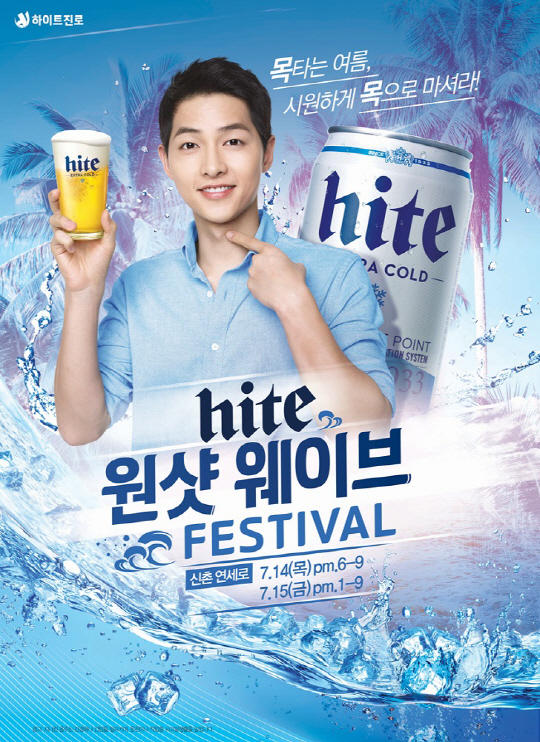 하이트진로는 오는 14일 목요일 신촌 연세로 일대에서 모델 송중기와 함께하는 ‘하이트 원샷 웨이브 페스티벌’을 개최한다고 11일 밝혔다.