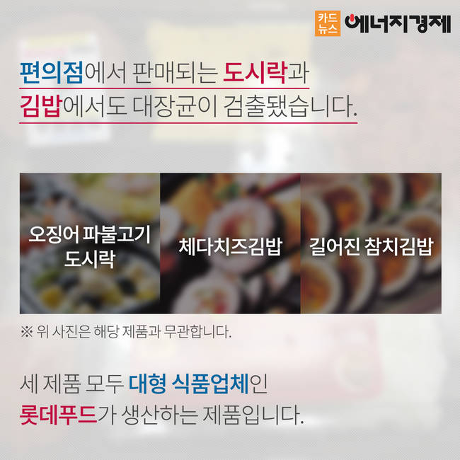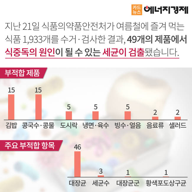 지난 21일 식품의약품안전처가 여름철에 즐겨먹는 식품들을 검사한 결과, 49개의 제품에서 식중독의 원인이 될 수 있는 세균이 검출됐습니다. 특히 우리에게 친숙한 편의점, 대형마트, 유명 음식점에서 판매하는 음식에서도 대장균이 발견돼 충격을 주고 있는데요.