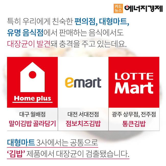 대형마트 3사인 홈플러스, 이마트, 롯데마트는 물론 대형 식품업체인 롯데푸드에서 생산하는 김밥과 도시락에서 대장균이 검출됐습니다. 심지어 젊은이들이 후식으로 즐겨 찾는 유명 빙수 브랜드 '설빙'에서도 대장균이 발견됐습니다.