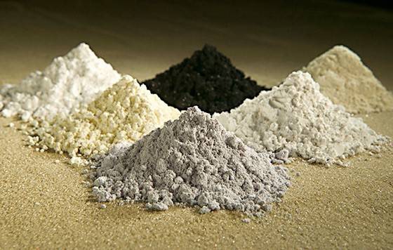 ▲LED, 스마트폰 등 첨단산업 소재에 필수적인 기초금속으로 분류되고 있는 희토류 산화물 사진.(가운데 위(검정색)부터 시계 방향으로) 프라세오디뮴, 세륨, 란타넘(란탄), 네오디뮴, 사마륨, 가돌리늄. |
