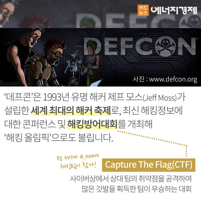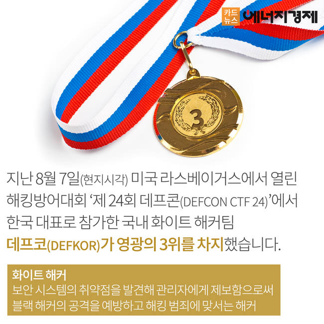 8월 초 미국 라스베가스에서 열린 해킹방어대회 ‘2016 제24회 데프콘(DEFCON)’에서 한국의 화이트해커팀 ‘데프코(DEFKOR)’이 영광의 3위를 기록했습다. 화이트해커란 보안 시스템의 취약점을 발견해 관리자에게 제보함으로써 악의를 가진 해커의 공격을 예방하고 범죄에 맞서는 해커를 의미하는데요.