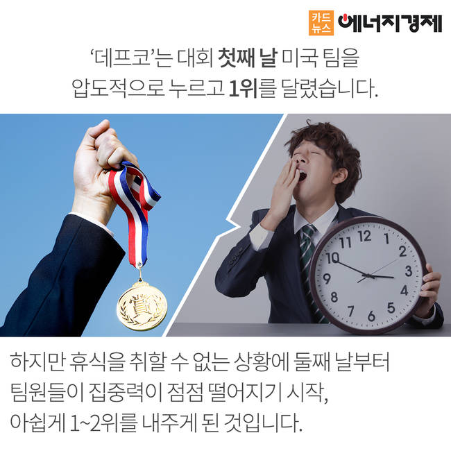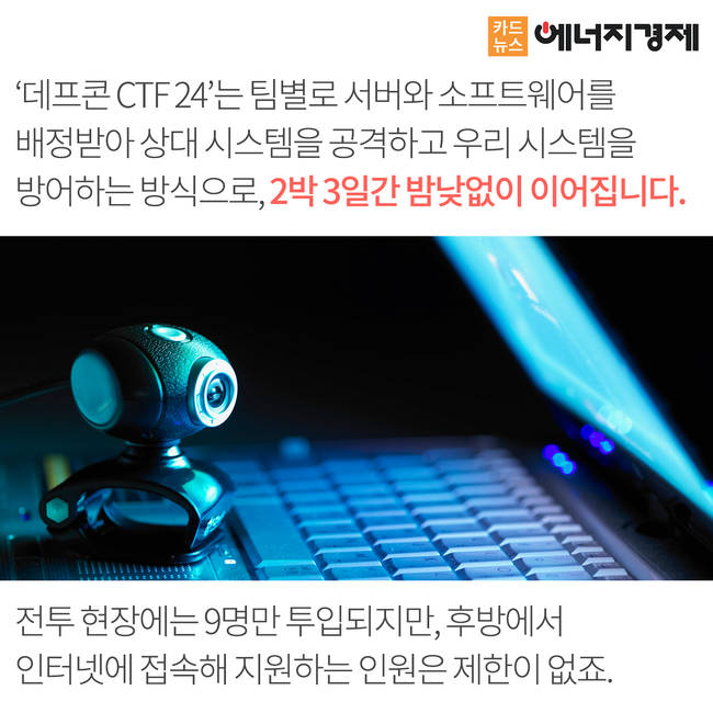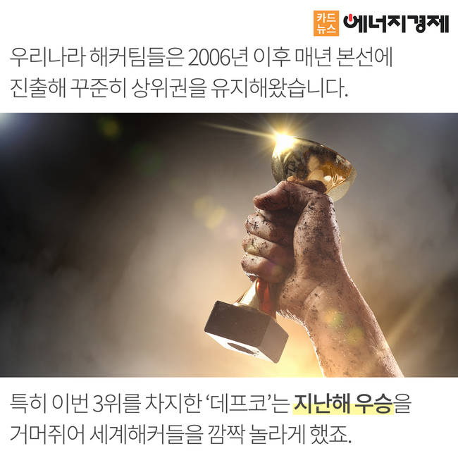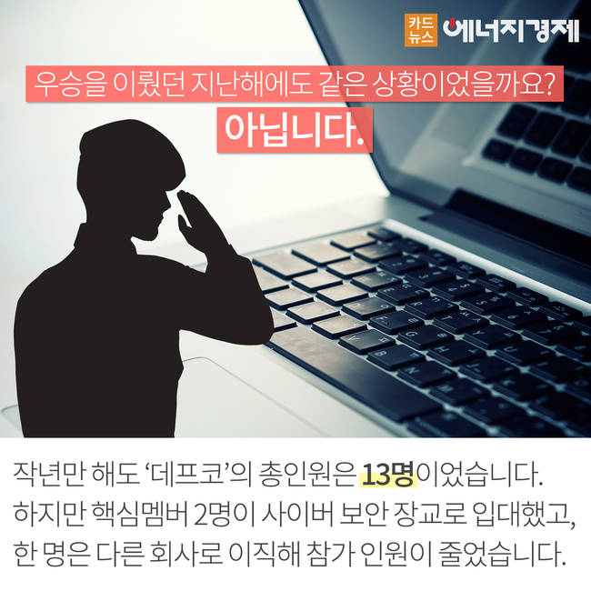 4,000여 해킹팀이 경쟁하는 데프콘에서 한국팀 데프코는 지난 해 우승을 기록해 세계를 놀라게 한 바가 있었습니다. 올해 데프코는 대회 첫째·둘째 날까지는 압도적으로 타국가들을 누르고 1위로 달렸으나 ‘수적 열세’로 인해 체력이 약화되어 결국 아쉽게도 1∼2위를 미국과 중국에게 내줬습니다.