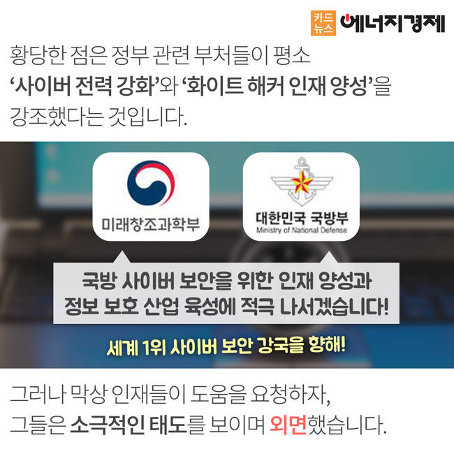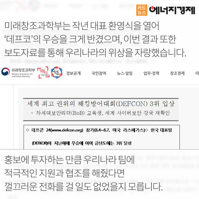 아이러니하게도 정부 관련 부처들은 평소에 '사이버 전력 강화'와 '화이트해커 인재 양성'을 강조하고 있으나 데프코 인재들이 대회를 위해 인력지원 도움을 요청하자 정부는 소극적인 태도를 보이며 외면했습니다.