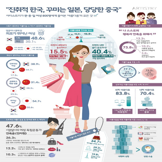 설문조사 결과에 따르면 국가별 아름다움의 기준을 묻는 질문에서 한국 여성들은 3개국 중 내면의 아름다움을 가장 중시하는 것으로 드러났다. 구체적인 답변으로 적극적인 ‘자기계발’, ‘일에 대한 능력’, ‘당당하고 독립적인 성격’과 같은 진취적인 여성상에 해당하는 항목 선택이 38.9%(중국 34.7%, 일본 17.3%)로 ‘뛰어난 외모’ 항목(30.1%) 보다도 오히려 수치가 높았다.