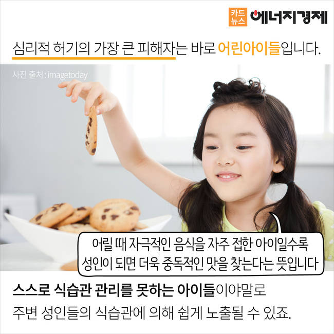 심리적 허기를 느끼면 인체는 설탕, 지방, 소금의 함량이 높은 자극적인 고칼로리 음식을 찾게 됩니다. 특히 스스로 식습관 관리를 못하는 아이들이야말로 주변 성인들의 식습관에 의해 쉽게 노출될 수 있죠.