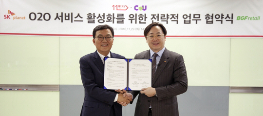 ▲BGF리테일 류왕선 부문장(좌측)과 SK플래닛 장진혁 부문장이 업무협약을 체결한 뒤 기념촬영을 하고 있다. |