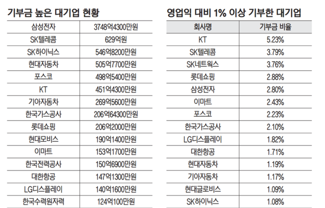 영업이익 대비 기부금 비율로는 KT가 1위를 차지했다. 이 회사는 영업이익의 5.23%나 기부를 한 것으로 나타났다. SK텔레콤과 SK하이닉스는 각각 3.79%, 3.76%로 각각 2,3위로 랭크됐다.