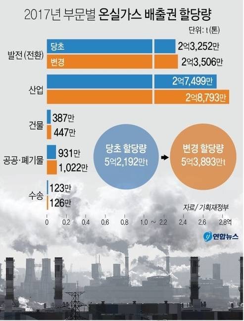 정부는 올해 총 6800만톤 규모의 배출권이 추가 할당됨에 따라 이를 감안해 이달 중 개별기업에 온실가스 배출권을 할당할 계획이다. 정부는 1차 기본계획에 이어 이날 2차 배출권 거래제 기본계획을 의결했다. 2차 계획은 2018∼2020년 3년간 적용된다. 2차 계획에 따르면 그동안 온실가스 배출권이 100% 무상할당됐지만 내년부터는 3%가 유상할당된다. 이에 따라 기업은 전체의 3%에 해당하는 배출권을 돈을 주고 구입해야 한다.