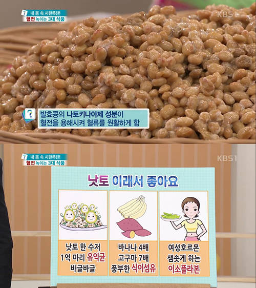 7일 방송된 KBS <무엇이든 물어보세요>는 환절기를 맞아 ‘내 몸 속 시한폭탄! 혈전 녹이는 3대 식품’을 주제로 진행, 혈관 속 노폐물 덩어리 ‘혈전’을 녹이는 천연 혈전 용해 식품의 대표주자 ‘낫토’를 비롯해 갓, 들깨를 소개했다.
