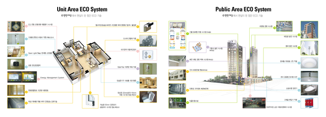 건설사들이 아파트에 적용하는 친환경기술도 진화하고 있다. 단열설계, LED조명등 등 에너지 효율을 높일 수 있는 기본적인 에너지 절감 요소에서부터 최근에는 IoT기술 적용을 통한 자동 절감 시스템, 친환경에너지 활용 등 기술 종류도 다양해지고 있다.