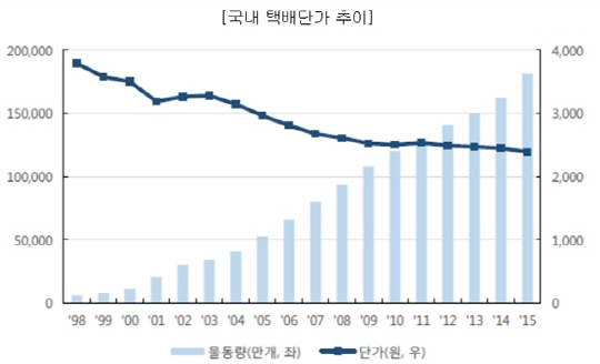 국내 택배산업은 지난 2004년 전국적인 영업망을 보유하고 있는 우정사업본부가 택배사업에 참여한 데 이어 후발주자들의 진입과 저가공세가 심화되면서 택배운임이 크게 하락하기 시작했다.