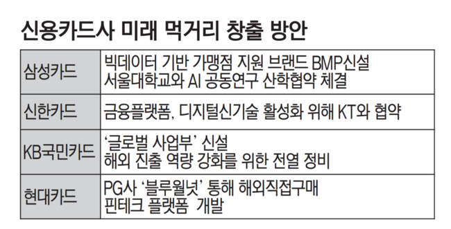 [에너지경제신문 이주협 기자] 다가오는 5월 장미대선에 후보들의 공통공약은 카드사 수수료 인하다. 신용카드사는 수수료 인하에 대응 차원으로 미래 수익을 끌어 올릴 수 있는 먹거리를 4차산업혁명과 해외진출을 통해 탐색하고 있다.