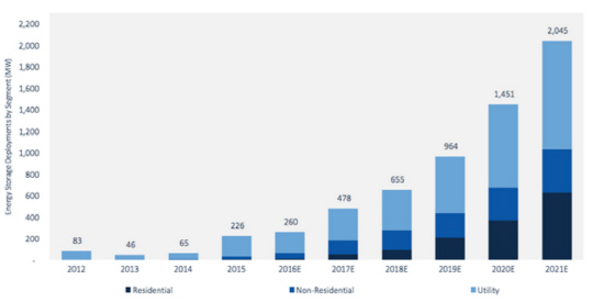 ESS의 성장세는 놀라울 수준이다. 시장조사전문기관 GTM 리서치에 따르면, 지난해 미국의 ESS 총설치 규모는 260MW에 달한 것으로 조사됐다. 성장 속도는 더욱 가팔라질 것으로 보인다. 올해 478MW, 2021년 2045MW까지 증가할 것으로 GTM 리서치는 전망했다.