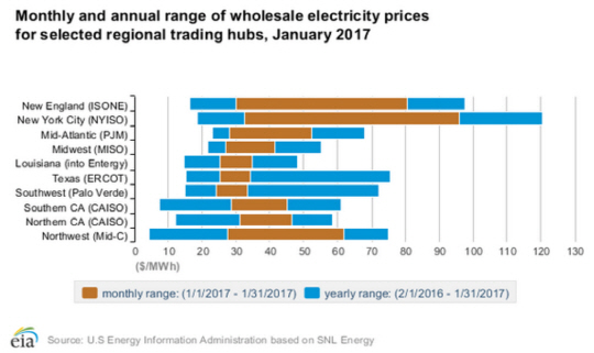위의 표는 미국 내 서로 다른 지역에서 거래되는 전력 도매가를 보여준다. 표에 따르면, MWh당 70∼110달러(kWh당 0.07∼011달러) 선의 가격에서는 미 북동부와 남서부, 텍사스 등지에서 경쟁력이 있는 것으로 집계됐다.