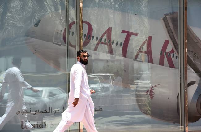 ▲사우디의 수도 리야드에 위치한 카타르 항공 지사 앞을 한 남성이 지나가고 있다. (사진=AFP/연합) |