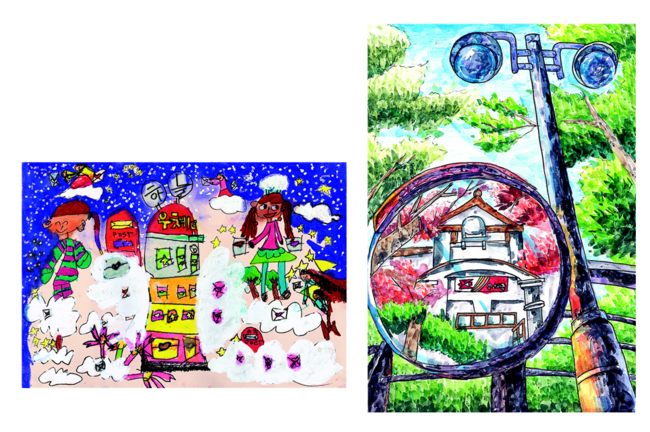 고학년 부문 윤지원양의 작품은 구도의 참신함과 표현의 독창성이 높게 평가됐다. 실제 사물이 아닌 사물을 비추는 오목거울을 통해 자연과 더불어 우체국을 아름답게 표현했다.