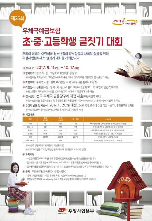 [에너지경제신문 이주협 기자] 우정사업본부가 초·중·고교생을 위한 ‘우체국 예금보험 글짓기대회’를 연다고 10일 밝혔다.