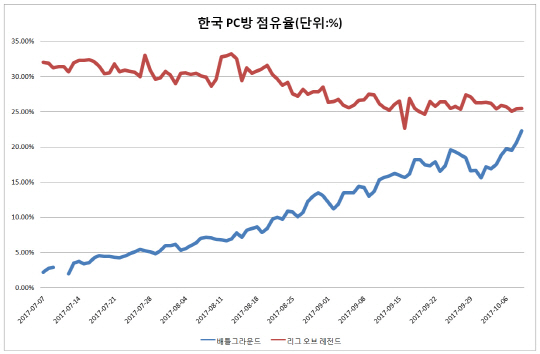 [에너지경제신문 이수일 기자] 블루홀의 온라인 게임 ‘플레이어언노운스:배틀그라운드’가 한국PC방 시장에서 점유율을 끌어올리며 라이엇게임즈의 리그오브레전드(LOL)와 선두 경쟁을 벌이게 됐다.