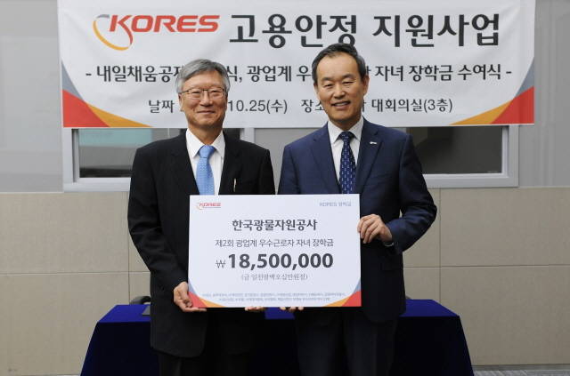 ▲광물자원공사 김영민 사장(우측)이 25일 열린 중소 광산 고용안정 협약식에서 광업협회 김영범 회장에게 우수근로자 자녀 장학금을 전달하고 있다.