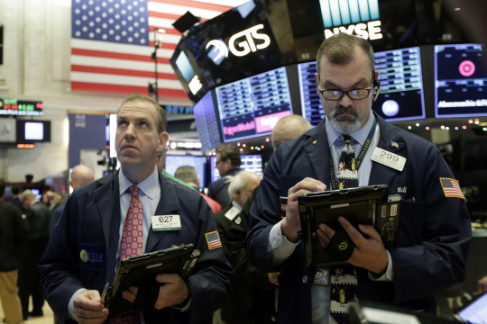 ▲트레이더 마이클 스미스(왼쪽)와 윌리엄 로렌스가 뉴욕증권거래소에서 근무하고 있다. (사진=AP/연합) |