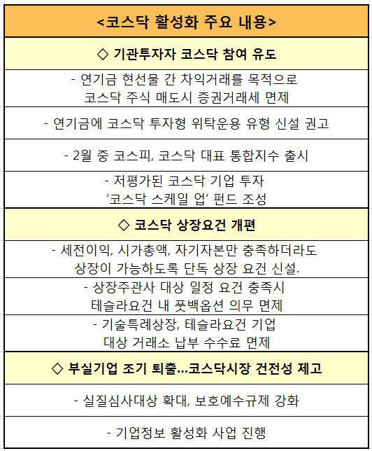 정부는 "코스닥 시장 자율성·독립성 강화, 상장요건 개편 등 규정개정을 통해 추진 가능한 과제들은 1분기 중 후속조치를 조속히 마무리할 것"이라며 "자본시장법, 조특법 등 법령 개정이 필요한 조치는 연내 개정 완료를 목표로 최대한 신속하게 추진하겠다"고 밝혔다.