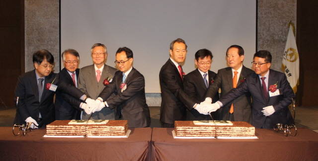 ▲한국광업협회는 11일 2018년 새해를 맞아 광업계 공동발전과 회원사간 친목 도모를 위해 대한광업협동조합 등 석회석 관련 4개 조합과 공동으로 서울 신도림 소재 쉐라톤 서울 디큐브시티 호텔 그랜드볼룸에서 ‘2018 광업계 신년인사회’를 개최했다. 사진은 새해 벽두 올 한해 발전과 건승을 기원하는 시루떡 절단 행사를 진행하고 있는 모습. |