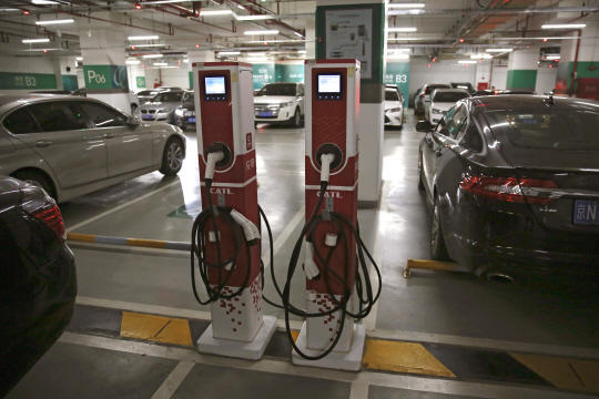 ▲중국 베이징에 위치한 한 쇼핑몰에 설치된 전기차 충전소. (사진=AP/연합) |