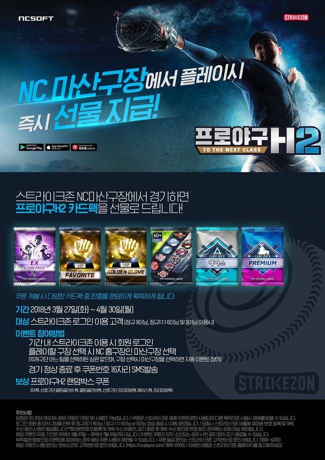 스트라이크존 이용 시 플레이할 구장을 NC 홈구장인 ‘마산구장’으로 선택하면 자동으로 이벤트에 참여할 수 있다. 경기 종료 시 발송되는 쿠폰을 H2 웹페이지를 통해 등록하면 EX팩, 골든글러브팩, 에이스팩, 프리미엄팩 등 다양한 H2 게임 아이템을 랜덤하게 받을 수 있다.
