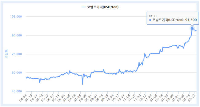 한편, 배터리 원자재 가격 폭등세는 진정될 기미를 보이지 않고 있다. 지난 3월 22일(현지시간) 런던금속거래소(LME) 코발트 현물 가격이 톤당 9만5500달러를 기록하면서, 상장 이후 최고기록을 갈아치웠다. 급증하는 전기차 수요에 힘입어 코발트 10만 달러 시대가 눈앞에 다가왔다.