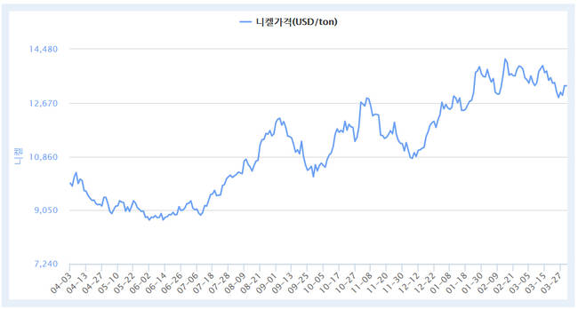 ▲지난 1년 간 니켈 가격 변화 추이. 니켈 가격은 지난해 6월 13일 기록한 1년 저점 톤당 8720달러에서 3월 30일 현재 1만3245달러로, 52% 가까이 폭등했다. (단위=톤당 달러, 표=한국광물자원공사) |