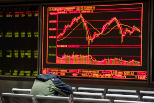 ▲중국 베이징의 한 증권회사에서 투자자 한 명이 주가 흐름이 표시된 모니터 화면 앞에서 휴식을 취하고 있다. (사진=AFP/연합)