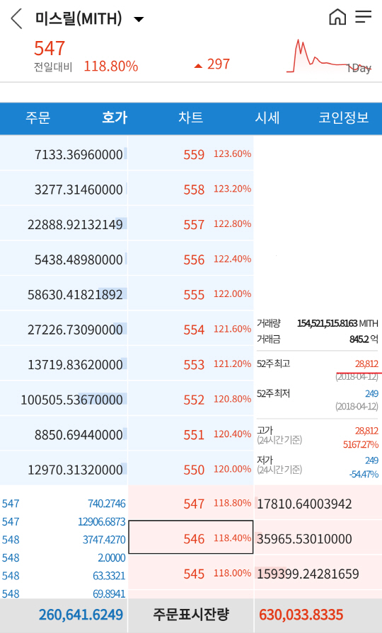한 업계 관계자의 이 같은 말을 들은 지 며칠이 채 되지 않은 상태에서 암호화폐 시장에 또 다시 문제가 불거졌다. 암호화폐 거래소 빗썸이 12일 신규 상장한 코인 ‘미스릴(MITH)’이 250원 시작가에 상장되자마자 가격이 폭등을 넘어서 수직상승했다. 최고가는 2만 8812원으로, 하루동안 115배(1만1500%) 이상 오른 것이다. 오후 6시에 250원으로 상장되더니 12시간도 안 돼 정점을 찍고, 다시 빛의 속도로 하락했다. 13일 현재는 550원(오전 10시 30분 기준)에 거래되고 있다. 550원은 전일 상장가 250원 대비로는 100% 오른 수치지만 100배 이상의 급등락이 반복돼 시장에 혼란을 더했다. 일부 고점에 구매한 사람들은 망연자실할 수밖에 없다.