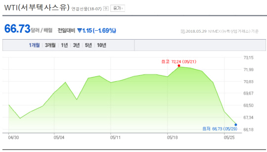 29일(현지시간) 뉴욕상업거래소(NYSE)에서 7월 인도분 서부 텍사스산 원유(WTI)는 전 거래일보다 배럴당 1.7%(1.15달러) 떨어진 66.73달러에 거래됐다. 이는 지난 4월 17일 이후 최저가다. 지난주 기록한 최고가 72.24달러에 비하면 18일부터 사흘새 7% 이상 폭락한 것이다. 런던 ICE 선물거래소의 7월물 브렌트유는 장 막판 오름세로 돌아서긴 했지만, 최고가 대비 6% 가량 내렸다.